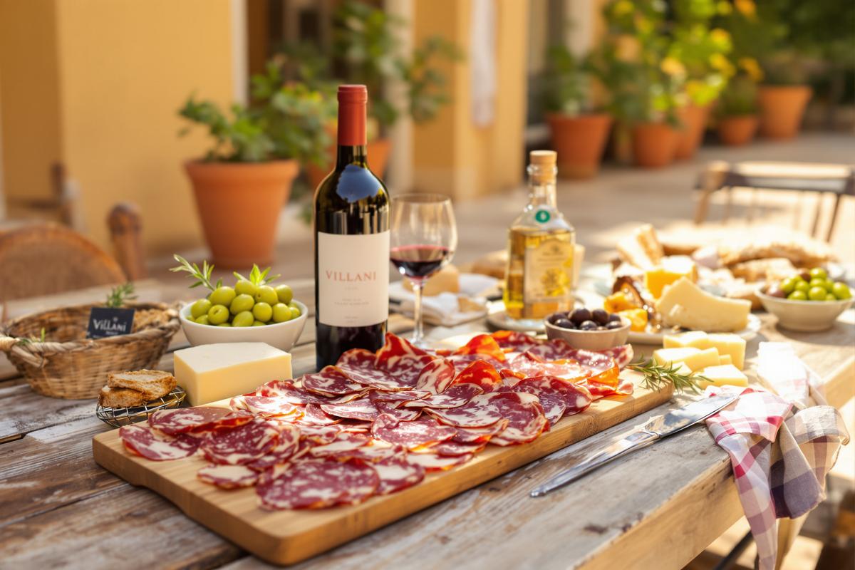 Le saucisson Villani s’accorde parfaitement avec des fromages à pâte dure comme le pecorino ou le parmesan affiné. Pour un contraste doux, optez pour un brie truffé ou une tomme légère. Côté vins, un Chianti ou un Barbera équilibrent bien sa richesse, tandis qu’un vin blanc sec type Vermentino accentue sa finesse. En apéritif, accompagnez-le aussi de pain de campagne et d’olives noires pour une touche méditerranéenne.