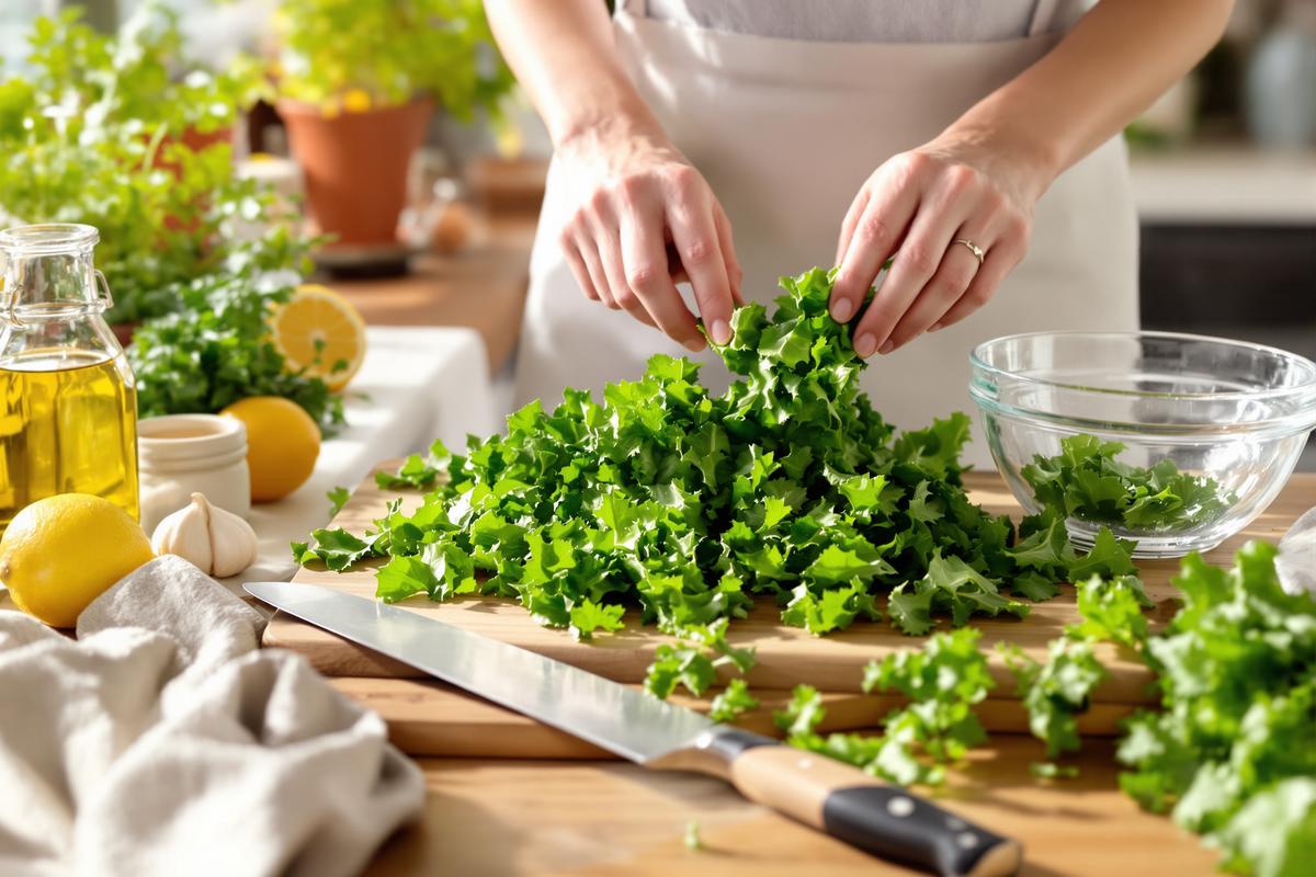 Pour profiter pleinement du chou frisé, il est important de bien le préparer avant cuisson. Commencez par retirer les tiges centrales, souvent dures et fibreuses, puis lavez soigneusement les feuilles à l’eau froide pour éliminer toute trace de terre ou d’insectes. Une astuce pratique : plongez les feuilles dans un saladier d’eau avec un filet de vinaigre blanc, puis rincez abondamment.